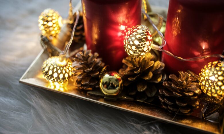Für meine erste Variante benötigt ihr ein längliches Tablett (ich habe ein goldenes gewählt), 4 große Kerzen (meine sind rot), Tannenzapfen, goldene Geschenke und kleine Christbaumkugeln. Dazu habe ich eine Lichterkette mit goldenen Kugeln gewählt. Viele der Deko-Artikel gibt es momentan in 1 Euro Shops zu kaufen, oder auch in Drogerie Märkten wie DM und Rossmann. Der Adventskranz ist super leicht, macht aber auch echt was her, vor allem die Lichterkette ist ein kleines Highlight und setzt tolle Akzente. 😉 Das selber machen dieses Adventskranzes geht zudem auch sehr schnell.
