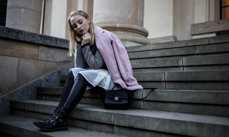 Biker Boots und schwarze kleine Tasche zum Auflockern des Looks