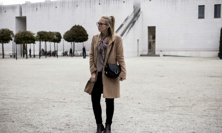 Schleifenbluse mit Pünktchen und Camel Mantel | Outfit